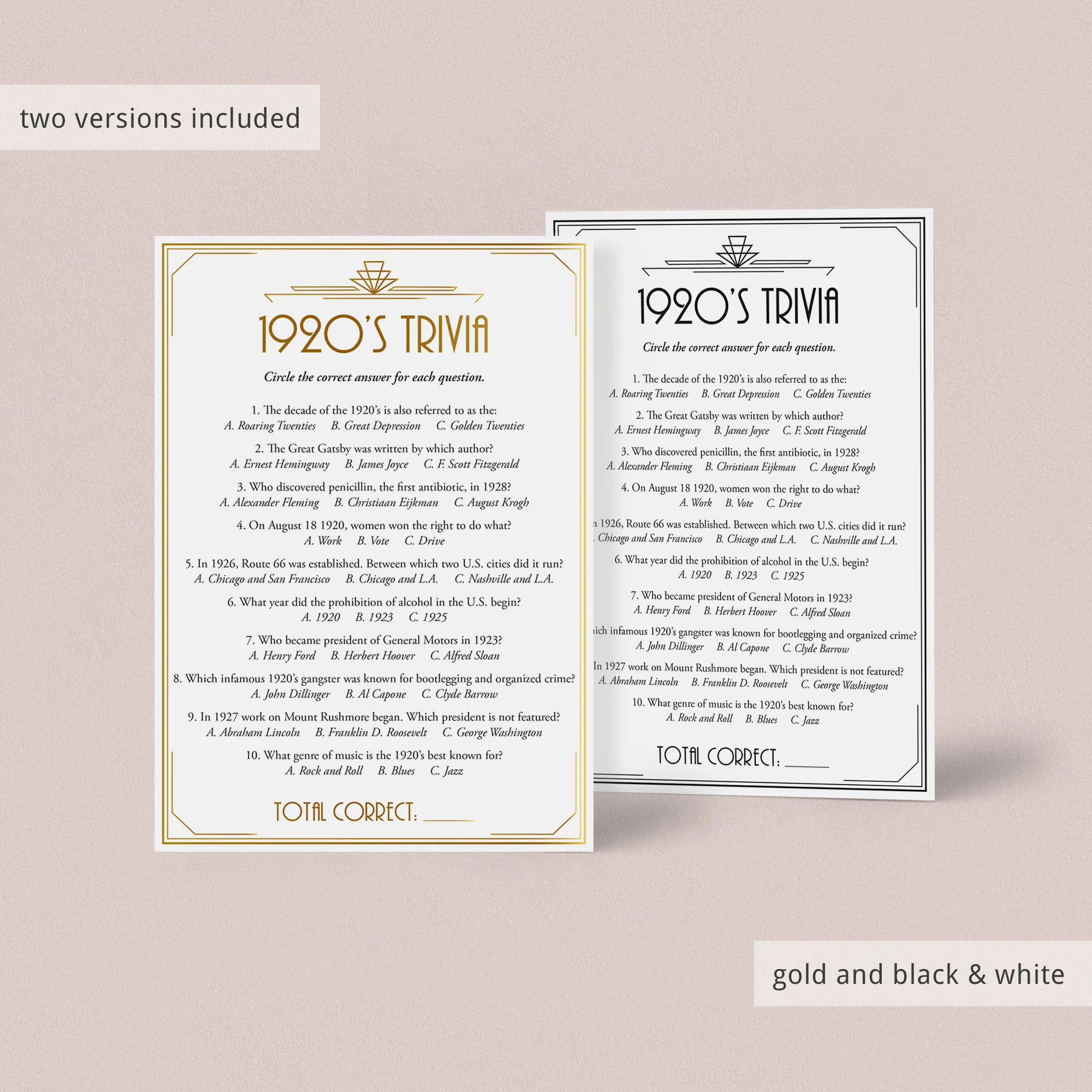The 1920 trivia game in art deco style, is the perfect addition to your Gatsby birthday party, Speakeasy party, Roaring Twenties themed bachelorette or bridal party or any other 1920's themed celebration.