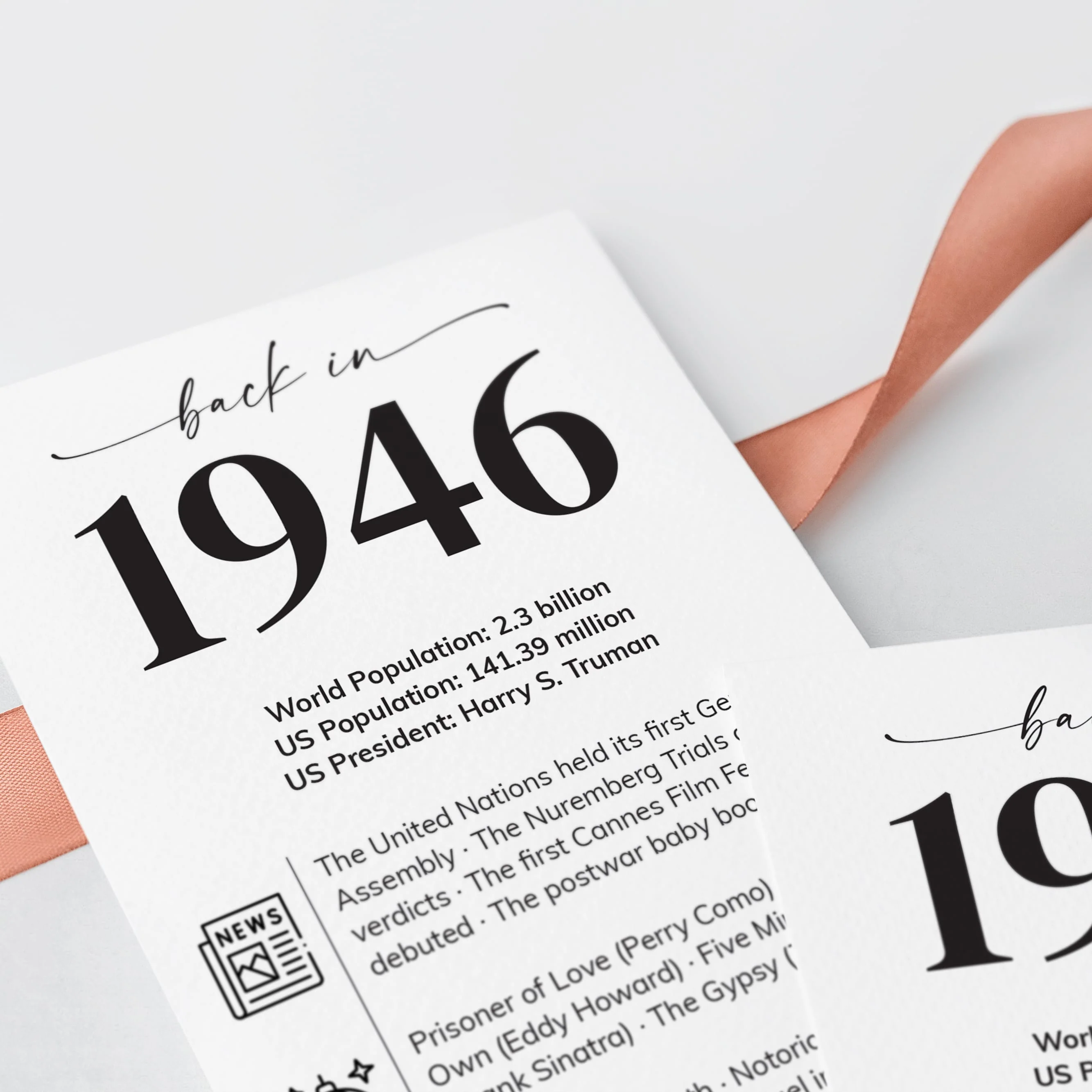 Personalized with the honoree’s name and birth date, this design combines entertaining facts from 1946 with clean icons for a fresh, contemporary look.