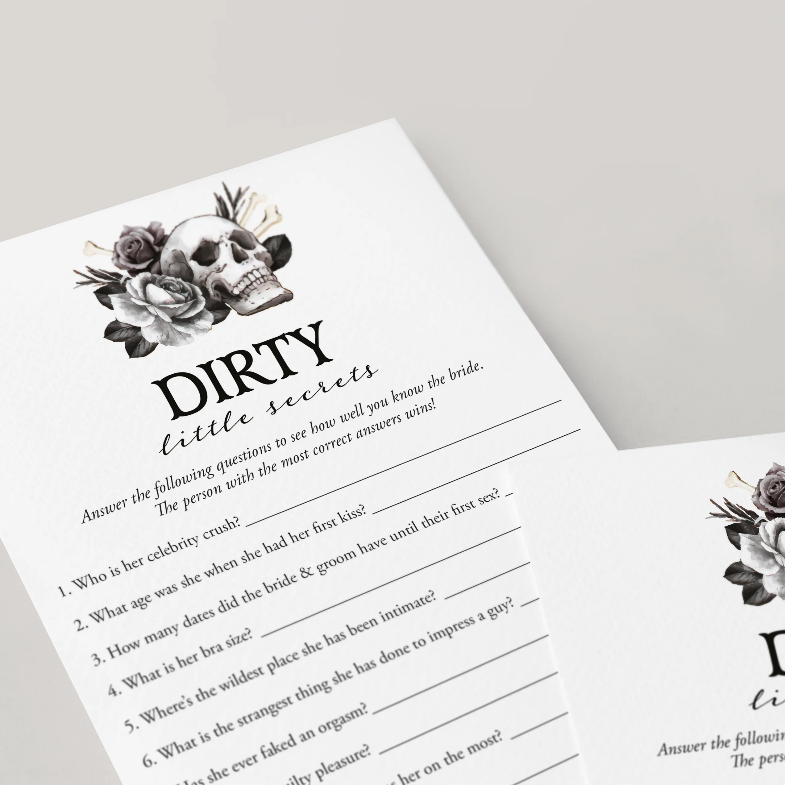 How well do you really know the bride? Test your hen party guests on who knows the bride best with this alternative Dirty Little Secrets game with black floral skull. The questions reveal a saucier side to the bride you might not recognize! It is a hilarious addition to your Halloween Hen Party, Bride or Die Bachelorette Party or Till Death Do Us Part Bridal Shower. You'll have your girls laughing in no time.