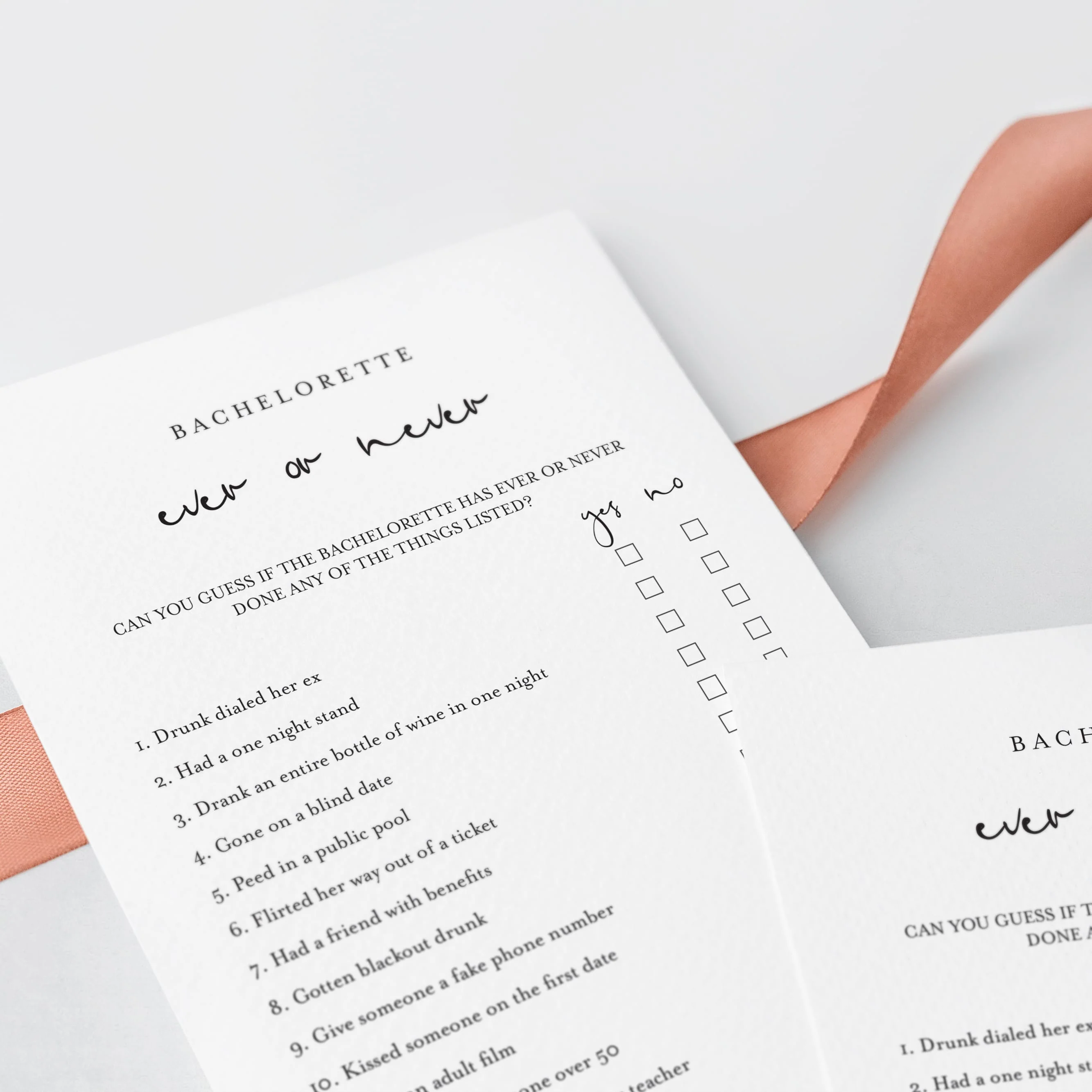This minimal bachelorette ever or never game an instant download. After purchase you will receive a download link immediately on screen. Also within minutes of your order and payment, an e-mail will be sent to you with a link for your download.