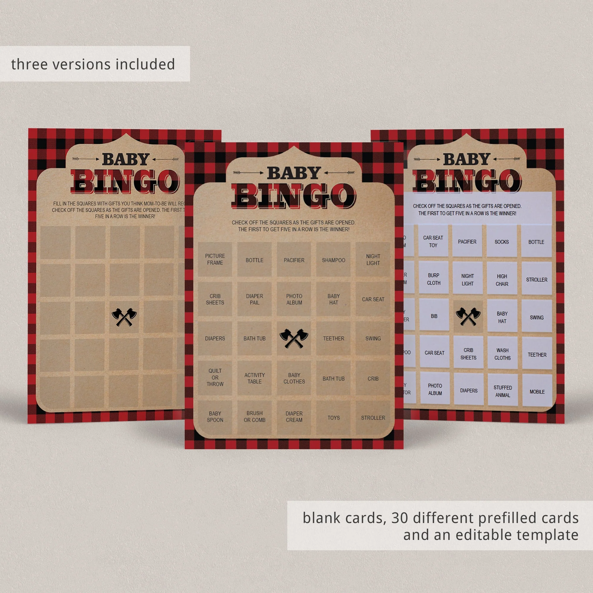Buffalo Plaid Baby Bingo Cards Prefilled, Blank and Template