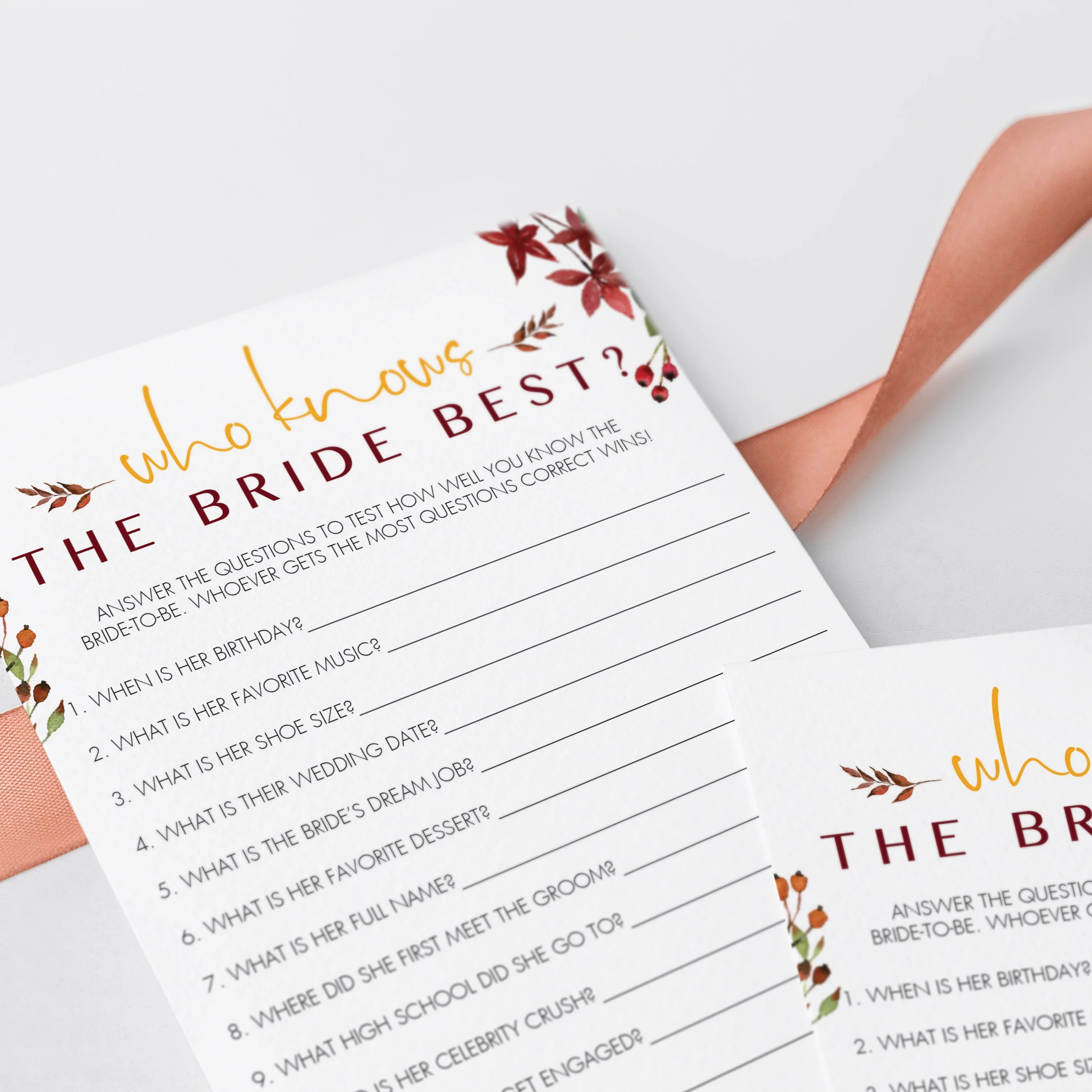 Test your wedding shower guests how good they know the bride and play ‘Who knows the bride best’ with these gorgeous burgundy floral game cards. A 'Who Knows The Bride Best' game is a great way to bring disparate people together and to put them all in a party mood. It's the perfect addition to your fall themed wedding shower.