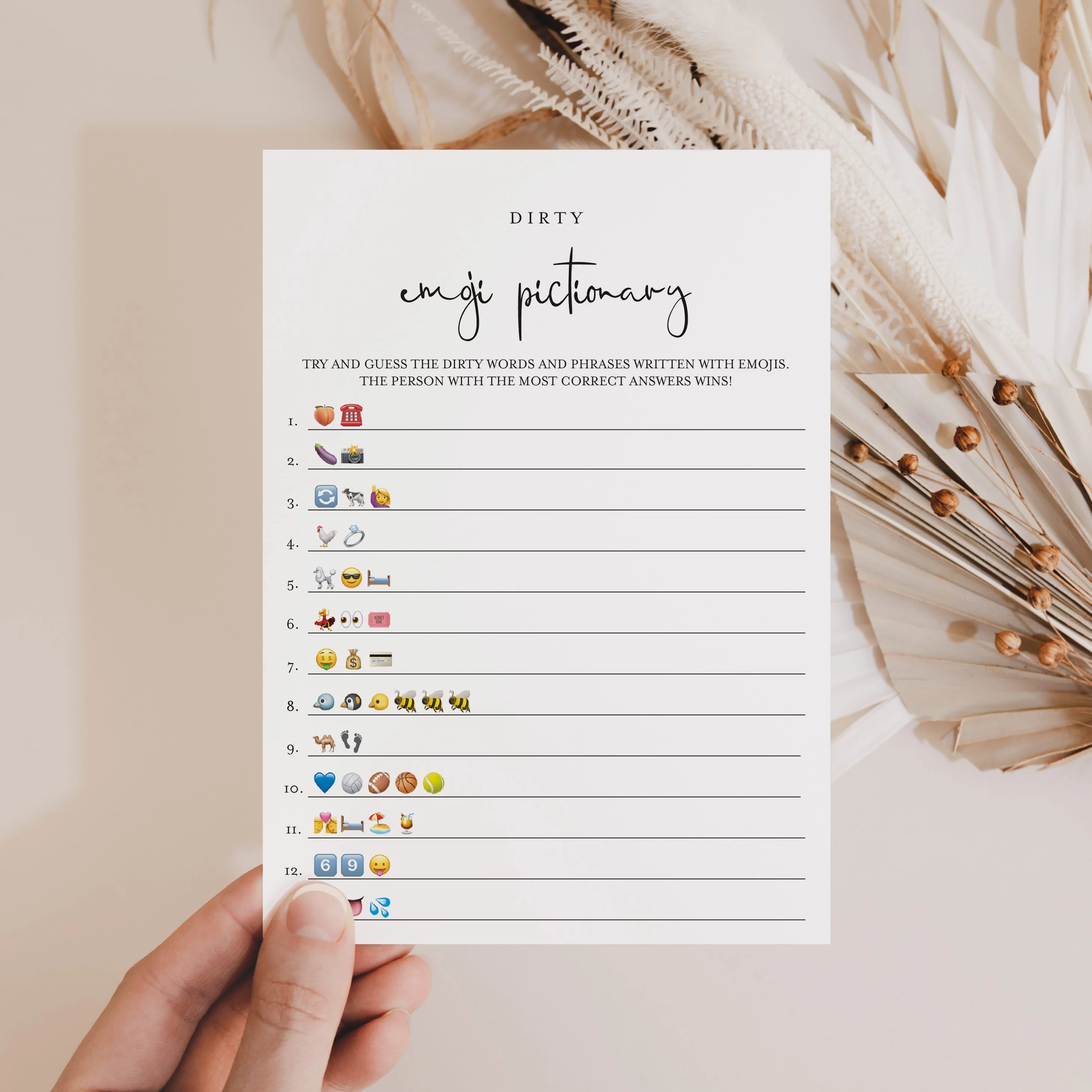 Are you looking for a unique game to play with your girlfriends? Play Dirty Emoji Pictionary with this minimalist Dirty Emojis game. It is a hilarious addition to your Bachelorette Party, Hen Night, Bridal Shower or Girl's Night. You'll have your girls laughing in no time.