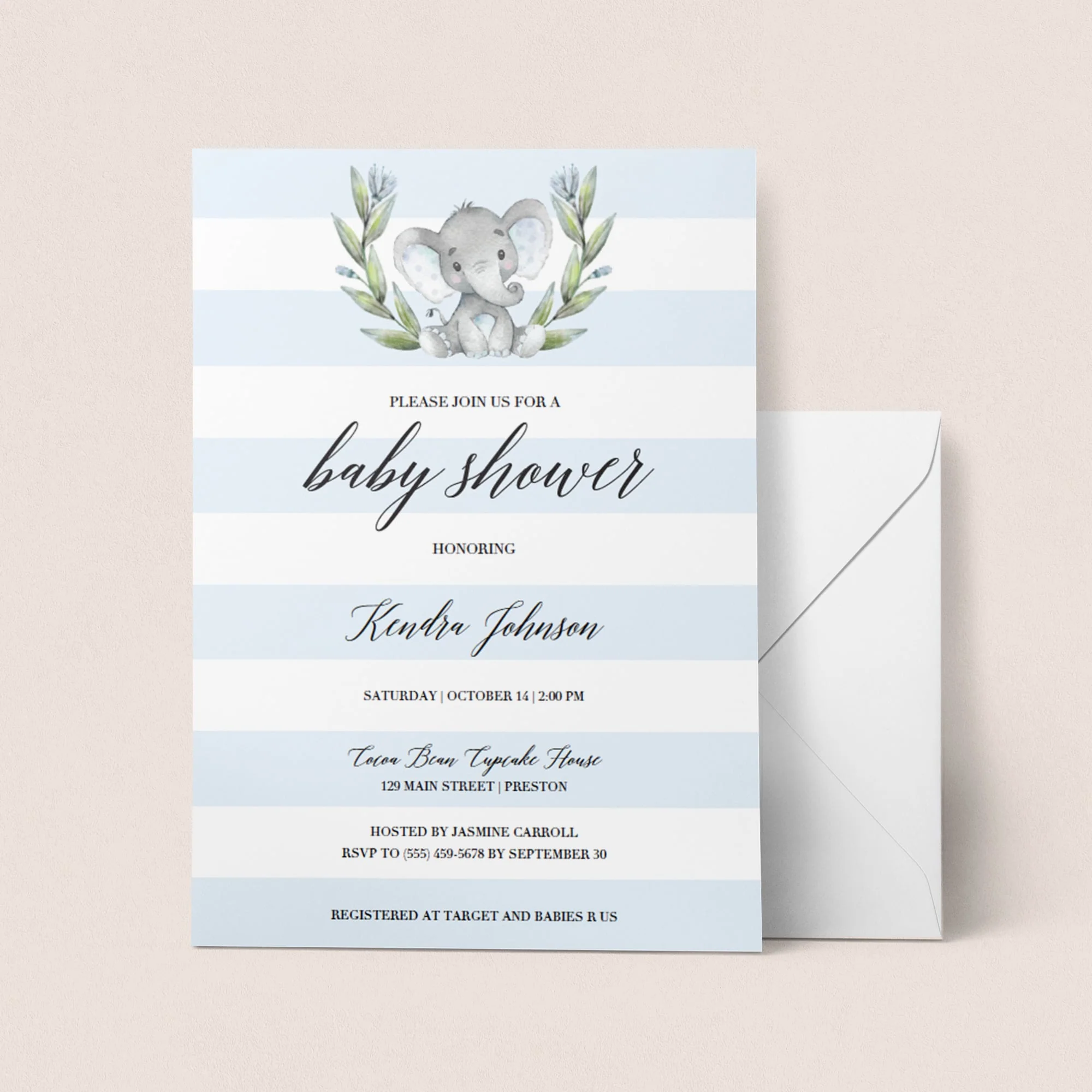 Are you hosting an elephant themed baby shower? Make the perfect announcement with this elephant themed boy baby shower invitation kit. The adorable elephant themed invitation kit includes the Baby Shower Invitation, a Diaper Raffle ticket and a Book Request card. It is perfect to celebrate the arrival of a little boy.