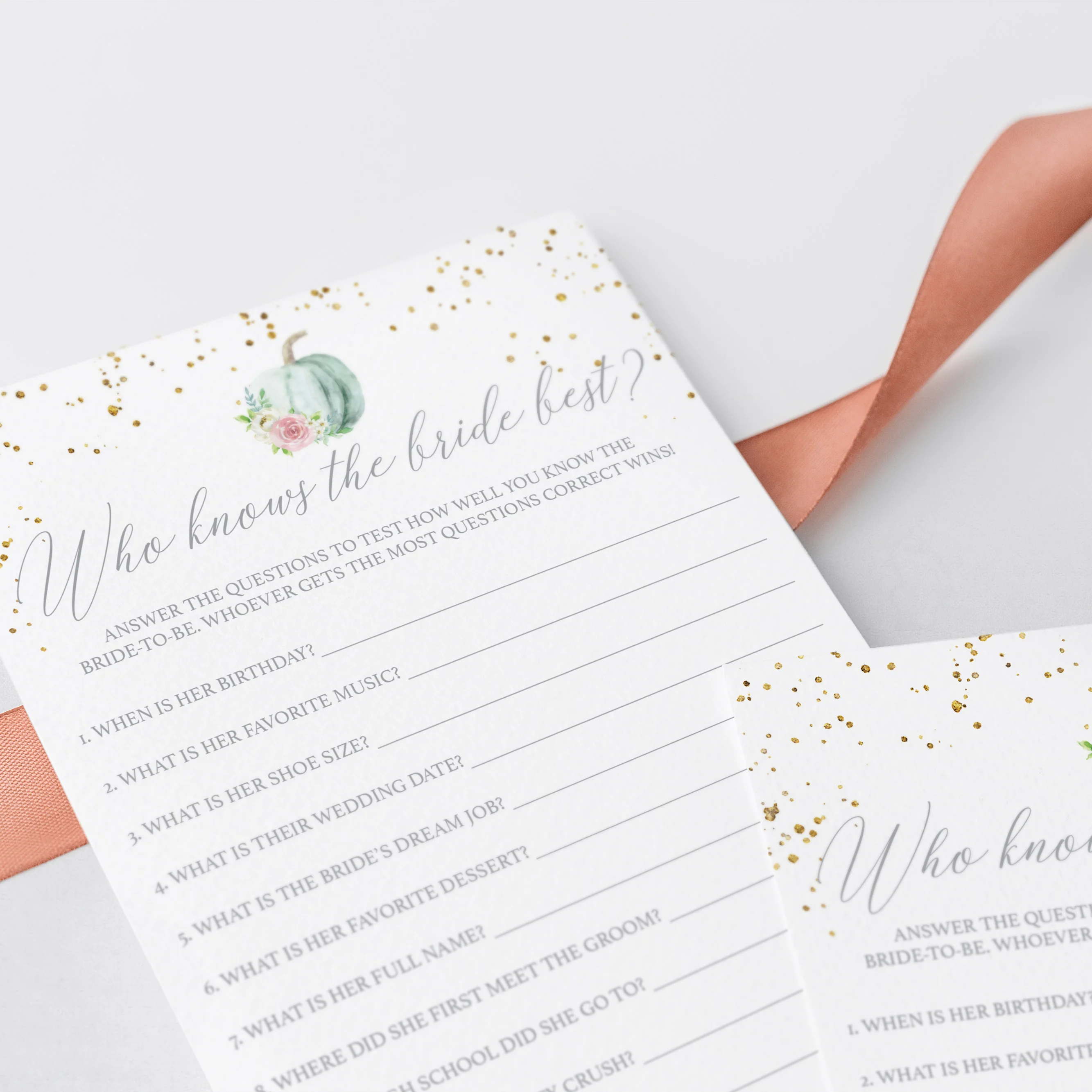 Test your bridal shower guests how good they know the bride to be and play ‘Who knows the bride best’ with these beautiful fall theme game cards with watercolor pumpkin. It's is a great way to bring disparate people together and to put them all in a party mood.