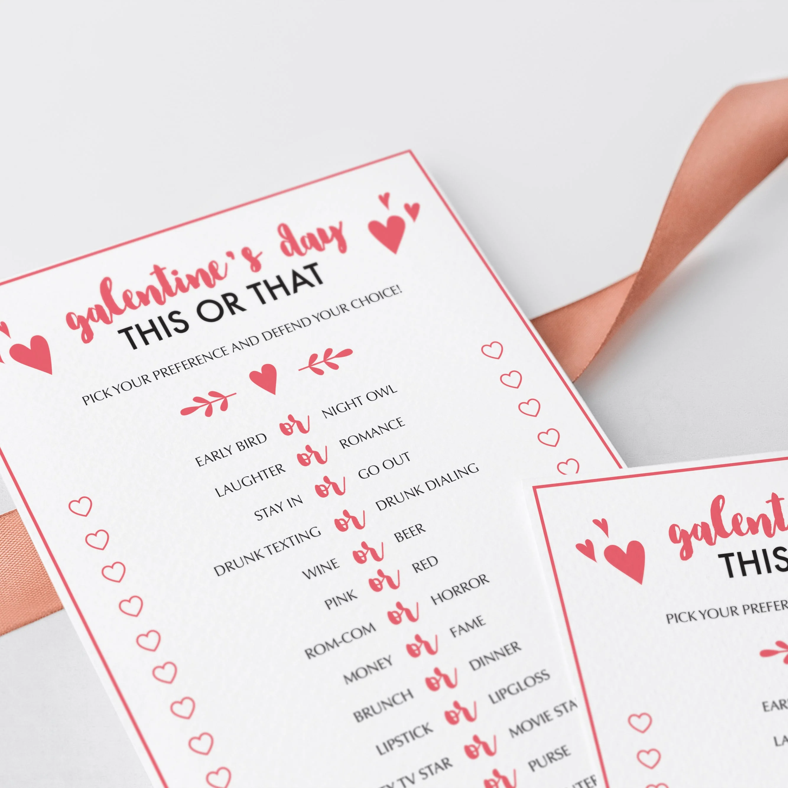 For an in-person Galentine's Day party, download and print the This or That game cards as many times as you need. We recommend printing on a nice heavy card stock for highest quality feel. Print right from your computer in a matter of minutes or have the cards printed at your favorite print shop.