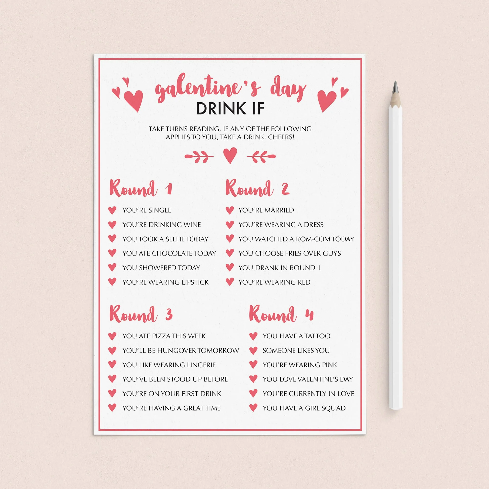 For an in-person Galentine’s Day Party, simply download and print the Galentine’s Day games as many times as you need. We recommend printing on a nice heavy card stock for highest quality feel. Print right from your computer in a matter of minutes or have the games printed at your favorite print shop.