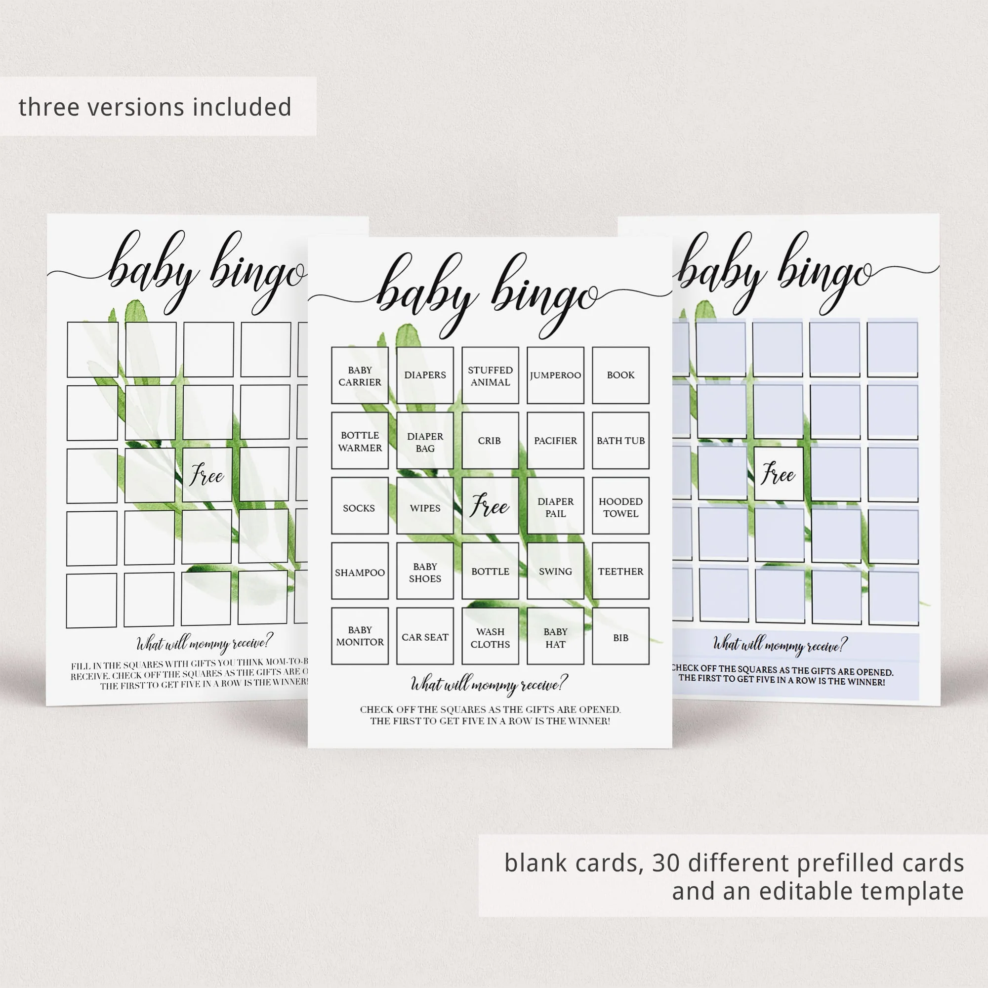 Let not only the mom-to-be enjoy unpacking gifts! Play Bingo with these greenery baby shower baby bingo cards. Check off the squares as the gifts are opened. The first to get five in a row is the winner!
