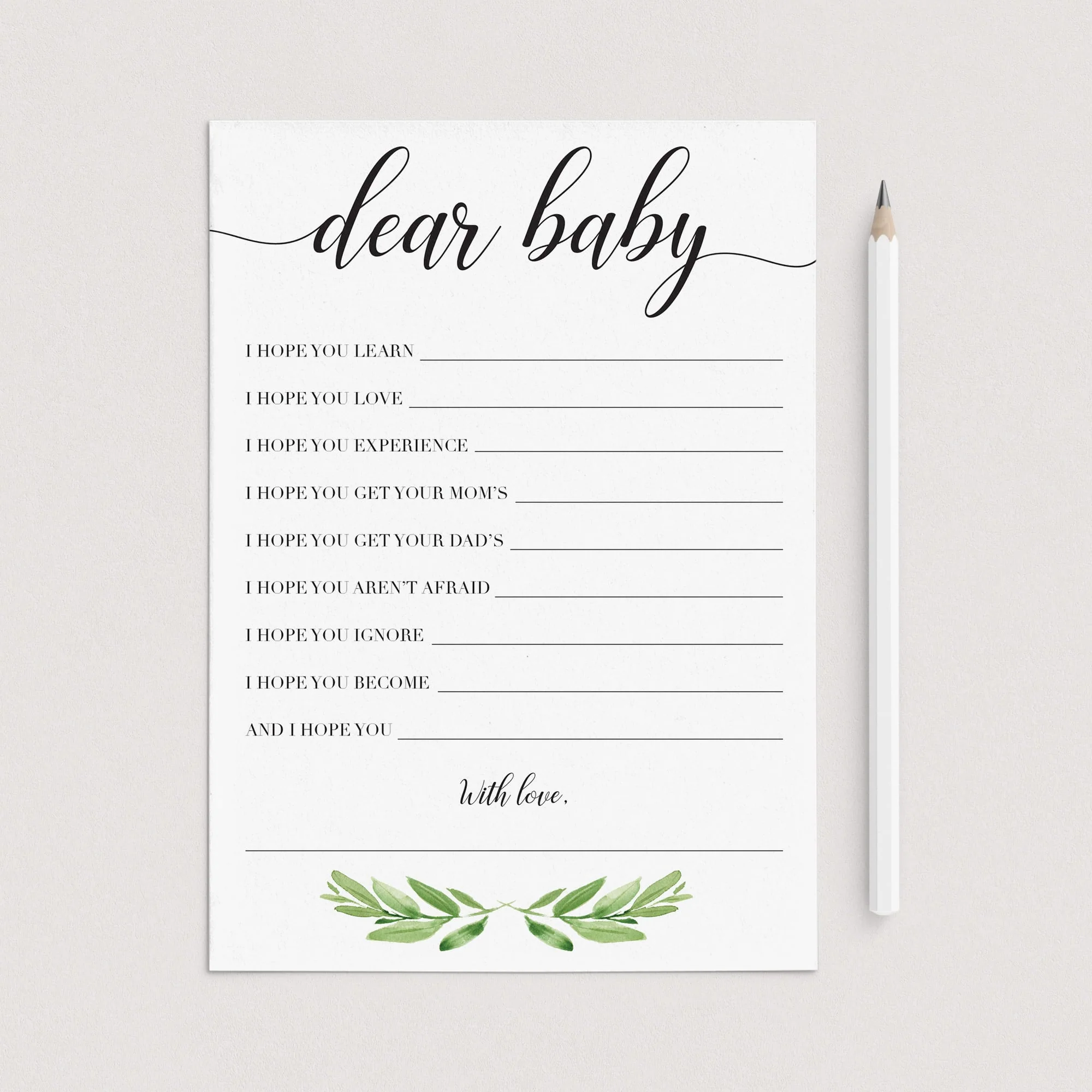 This greenery baby shower games pack includes the following popular baby shower keepsakes:
