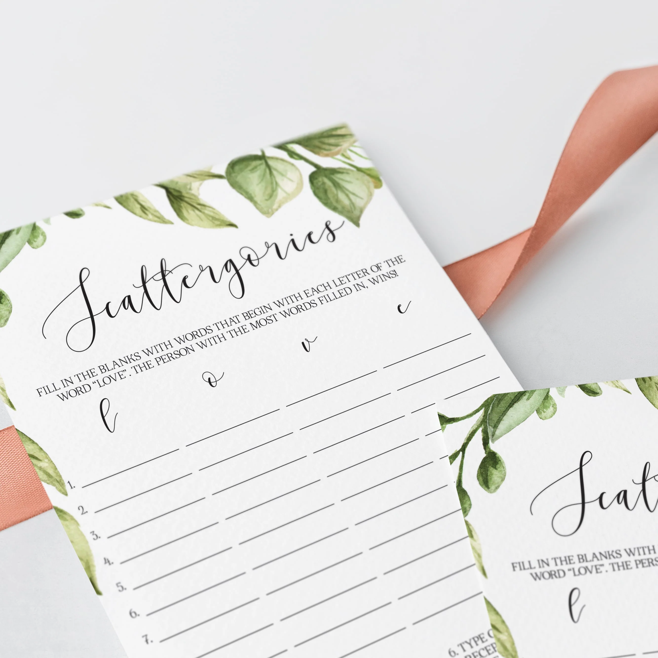 How many words can you fill in with the letters "L", "O", "V" and "E"? Play bridal Scattergories with these gorgeous greenery game cards to ensure lots of fun and laughter.