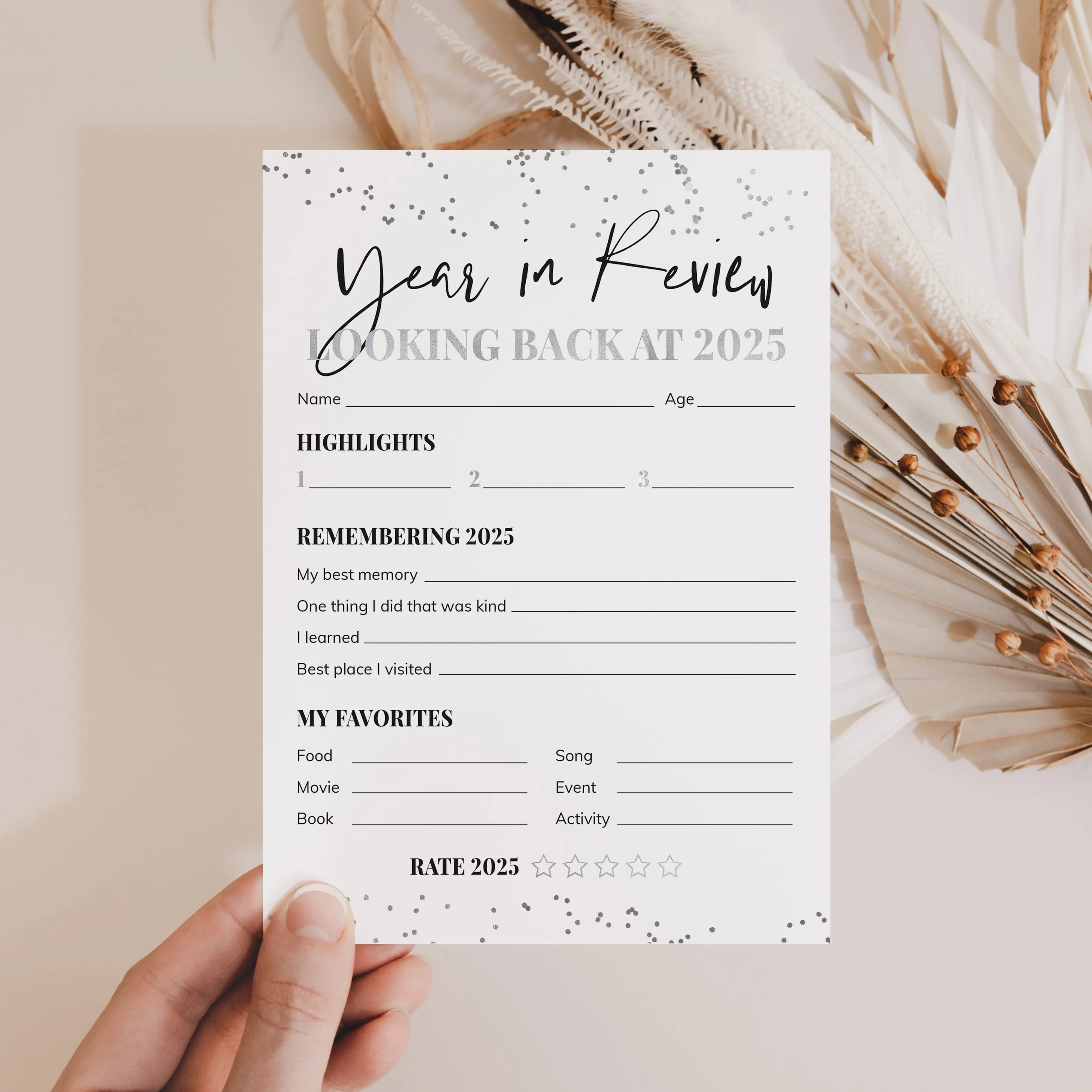 Take a look back at 2025 and look ahead to 2026 with these glittery New Years Resolution Cards with silver confetti.