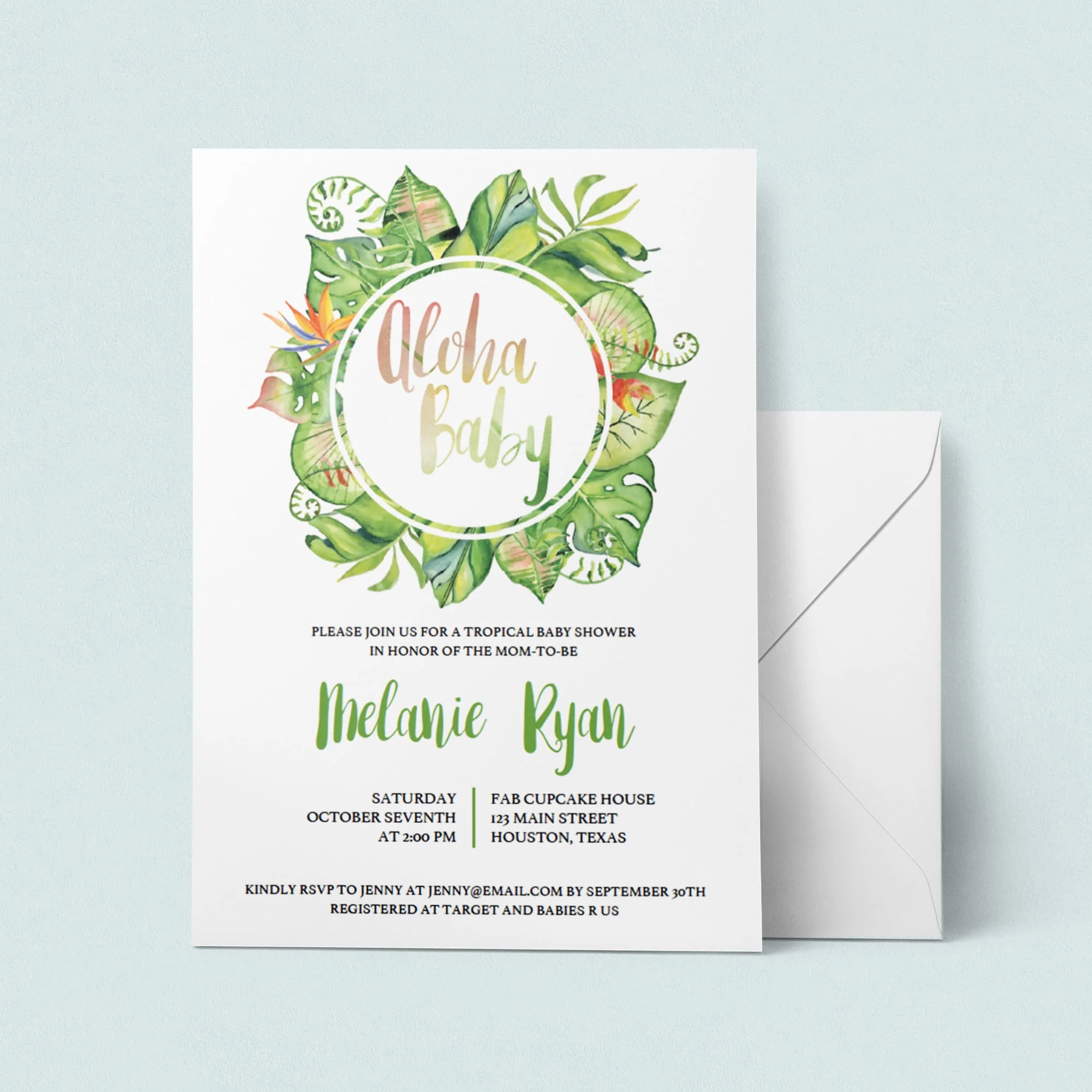 Aloha Baby! Guests will be delighted when they receive this tropical baby shower invitation set. The sunny watercolor design with shades of green is perfect for a gender neutral baby shower. Included in the set are the Baby Shower Invitation, a Diaper Raffle ticket and a Book Request card.