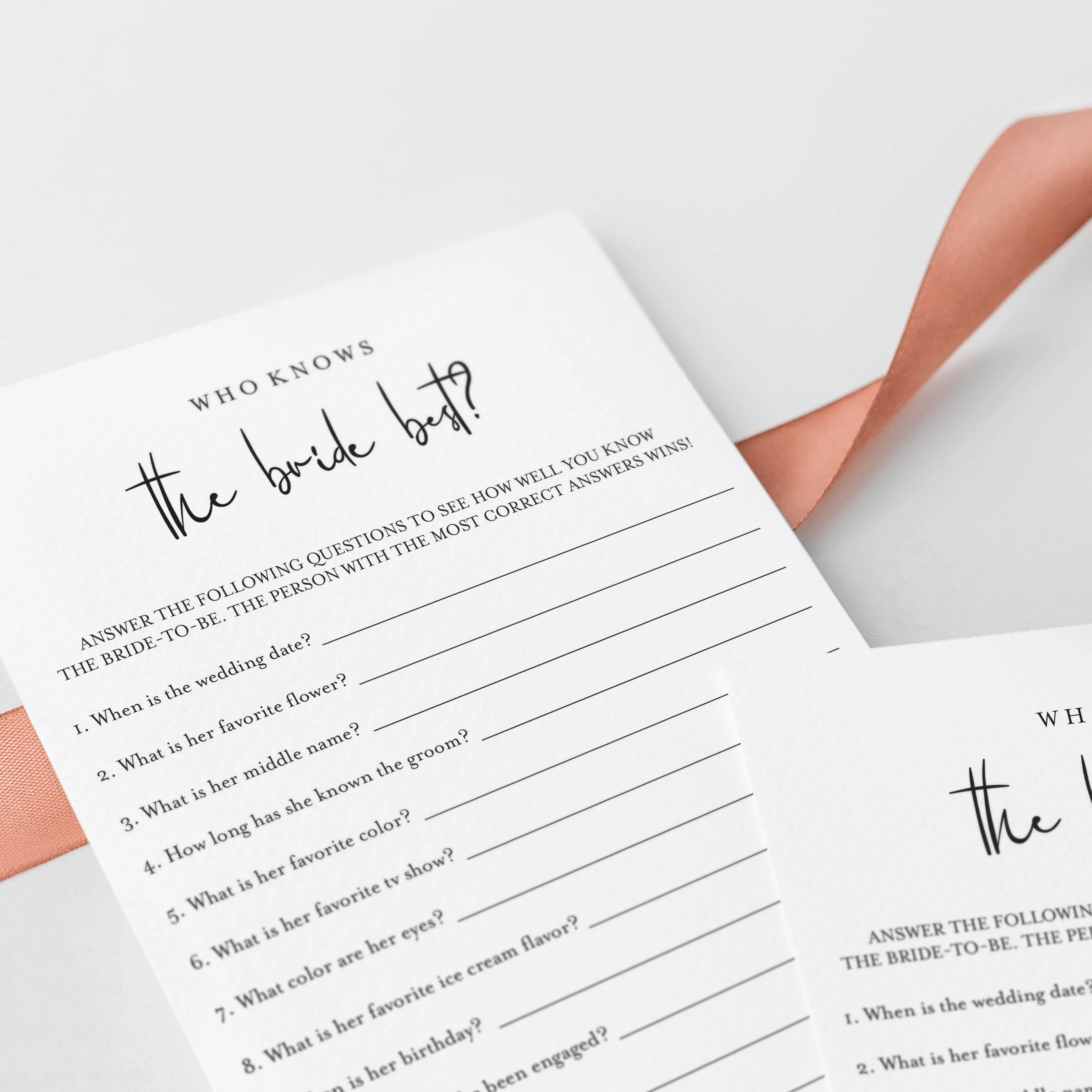 Test your bridal shower guests how good they know the bride to be and play ‘Who knows the bride best’ with these modern minimalist game cards. A 'Who Knows The Bride Best' game is a great way to bring disparate people together and to put them all in a party mood. This minimal design is so versatile, it will fit any bridal shower theme.