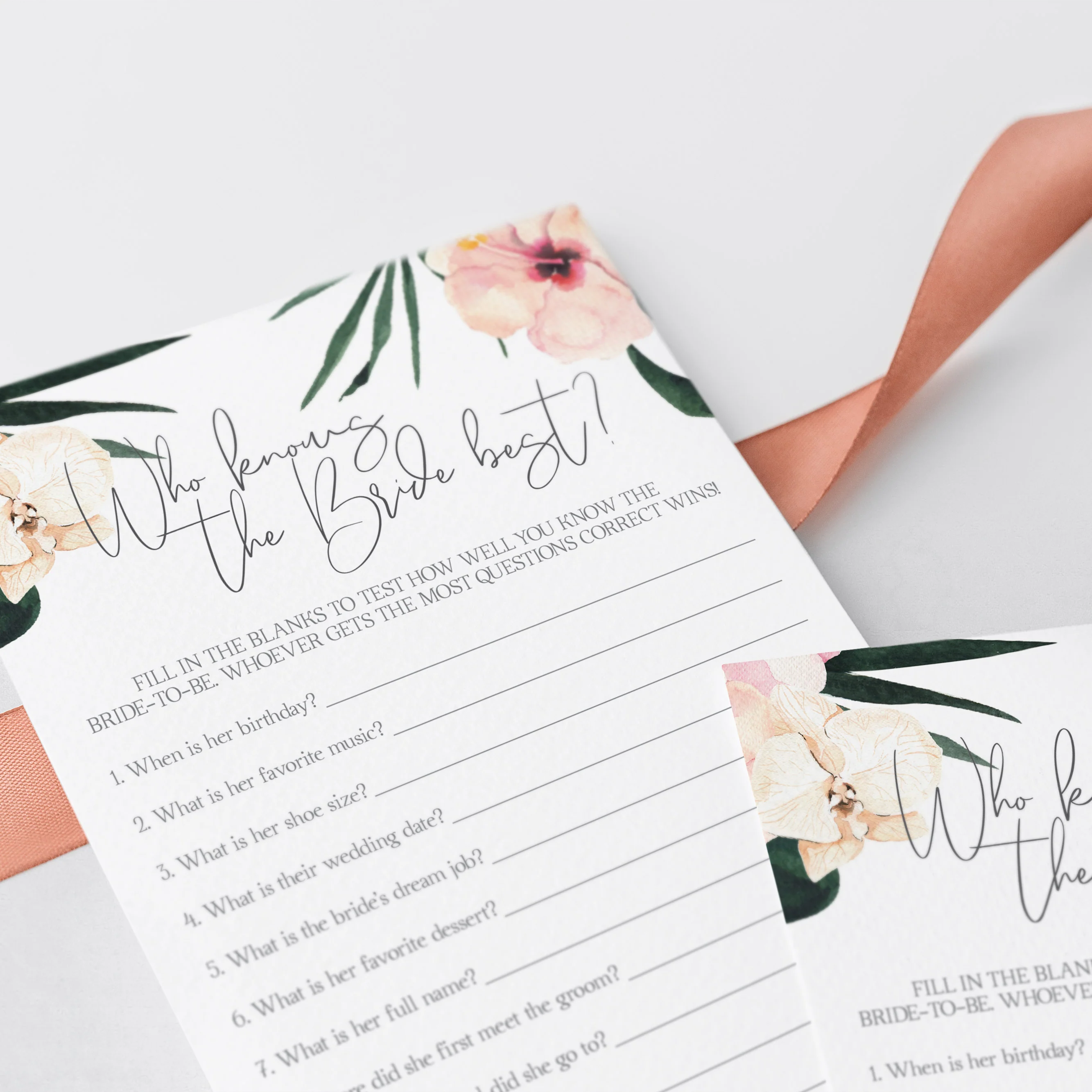 Test your bridal shower guests how good they know the bride to be and play ‘Who knows the bride best’ with these beautiful summer theme game cards. A Bridal Shower Quiz is a great way to bring disparate people together and to put them all in a party mood.